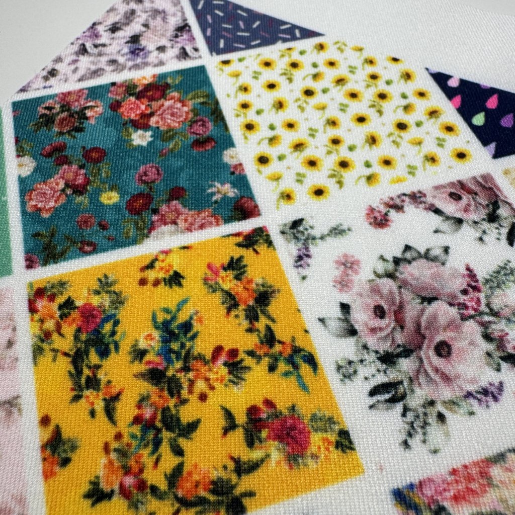 Vzorek materiálu o velikosti cca 15x20cm. Pro lepší představu jsme látku potiskli různými vzory - světlými i tmavými.